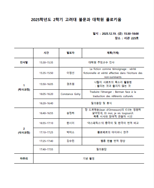 2025년 2학기 불어불문학과 대학원생 콜로키움이 지난 12월 19일 금요일 고려대학교 서관 225호에서 열렸습니다.